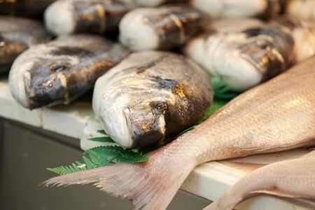 Raw delicious fresh fish on ice on market store shop. Dorado fish on ice.