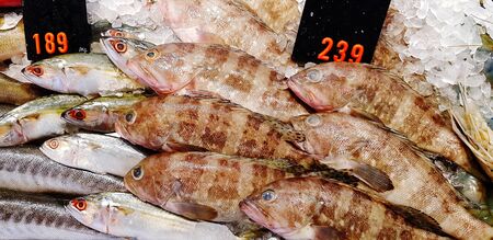 Close up fresh grouper, tuna and mackerel freeze on ice with price tag for sale at seafood market or supermarket