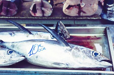 Fresh fish for sale in the fish market Pescheria of Catania, Sicily, Italy