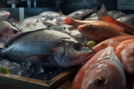 Fresh ocean fish and seafood at the fish market Close up Top view created with Generative AI technology.