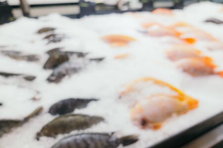 Abstract blur and defocus raw fish meat in supermarket in shopping mall and department for background