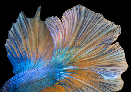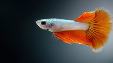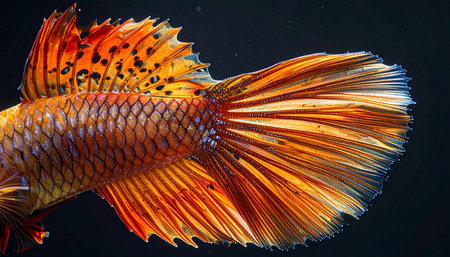 A close-up captures the magnificent, flowing tail of an orange betta fish, its scales shimmering like jewels against a dark backdrop. The delicate fins fan out in a display of natural elegance and vibrant color, creating a sense of graceful movement and aquatic beauty.