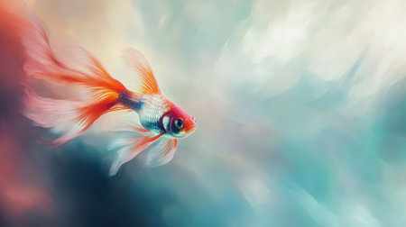A vibrant goldfish gracefully swims through a soft, blurred background filled with gentle colors, creating a serene underwater scene full of life and beauty.