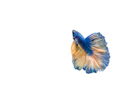 The movement white, yellow, blue halfmoon betta splendens fighting fish on isolated black background with clipping part. The moving moment beautiful of white Siamese betta fish with copy space.