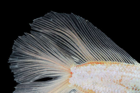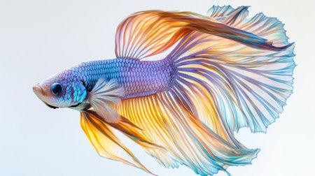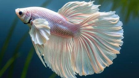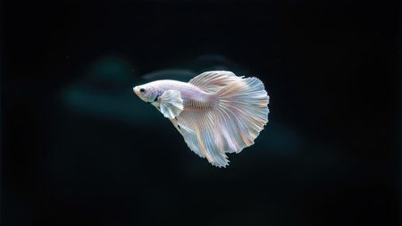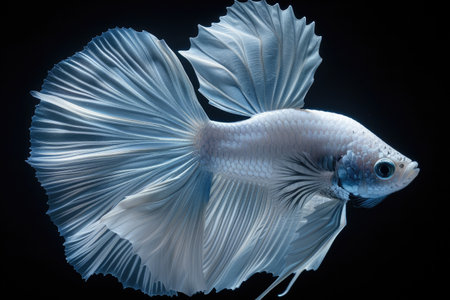 A close-up studio shot showcases a delicate white betta fish, its flowing fins creating a graceful form. The image highlights the fish's iridescent scales and intricate details against a deep, contrasting background. This composition offers potential use for educational content or commercial applications related to aquatic life.