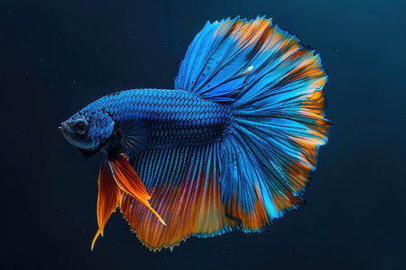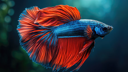 This stunning image showcases a vibrant betta fish with flowing fins and striking scales, swimming gracefully against a dark background, displaying its beautiful colors.