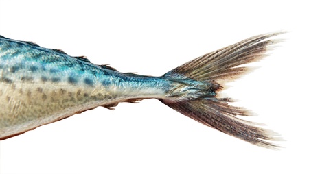 Close up of a vibrant fish tail in electric blue and violet colors underwater