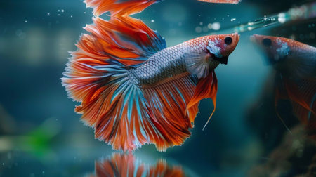 A stunning betta fish swims gracefully through an underwater scene, surrounded by bubbles and aquatic plants. This vibrant image captures the beauty and elegance of marine life.
