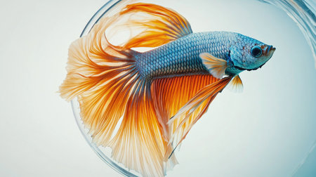 A serene image of a betta fish with its colorful fins elegantly spread, swimming in a clean, clear bowl, against a minimal white backdrop
