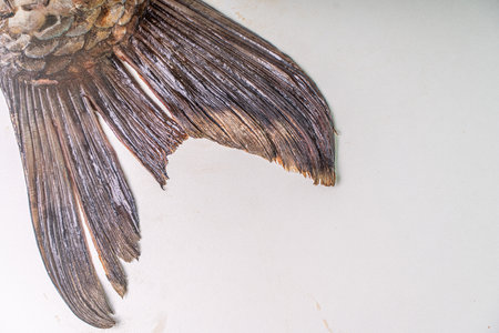 Tail of caught pike fish trophy on snow. Winter fishing background