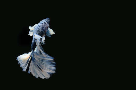 White Betta spendens fighting fish (Rosetail) Halfmoon fancy in Thailand on isolated black background with copy space. The moving moment beautiful Siamese betta fish with clipping path.