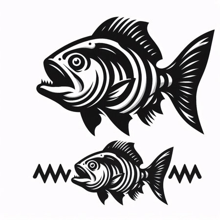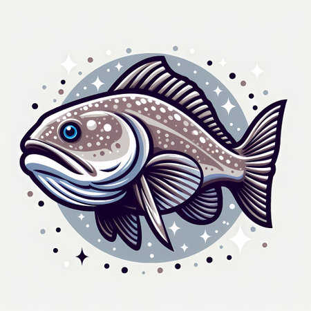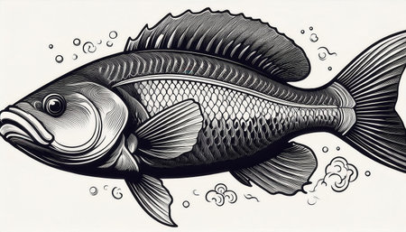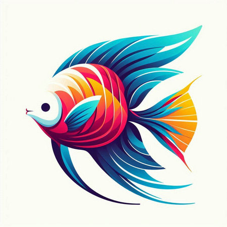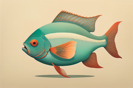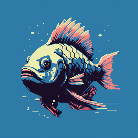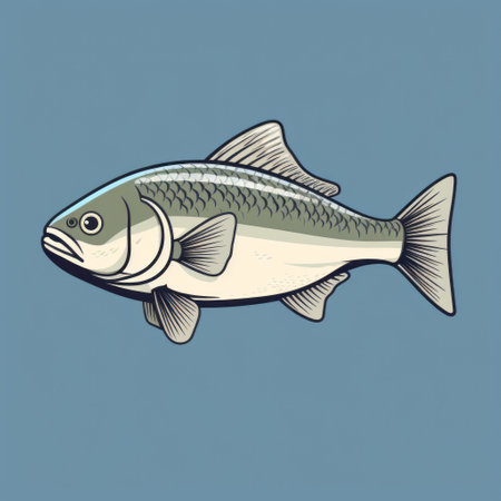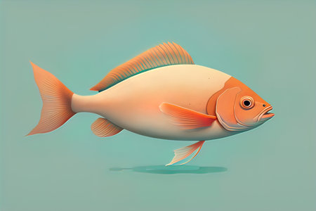 a fish with a white fin gracefully swims against a vibrant blue background in this simple yet captivating illustration. the dark silver and light beige color palette adds a touch of elegance to the artwork. with its bold outline and strong sense of realism, this mid-century style illustration is perfect for scientific or grid-based designs. ai generated