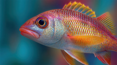 Detailed close-up of a sea fish with an intricate scale pattern, set against a serene blue ocean backdrop