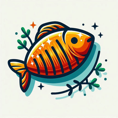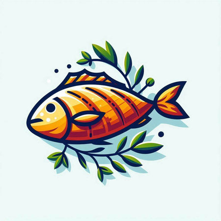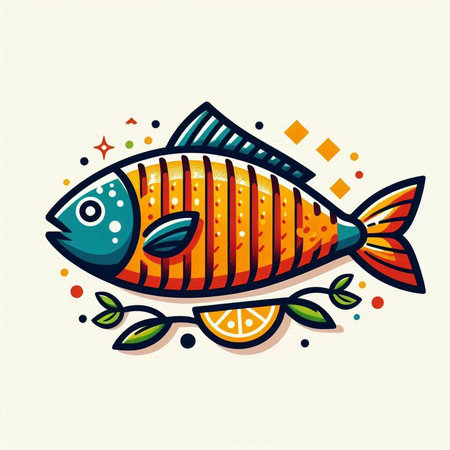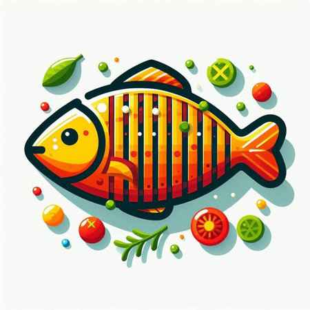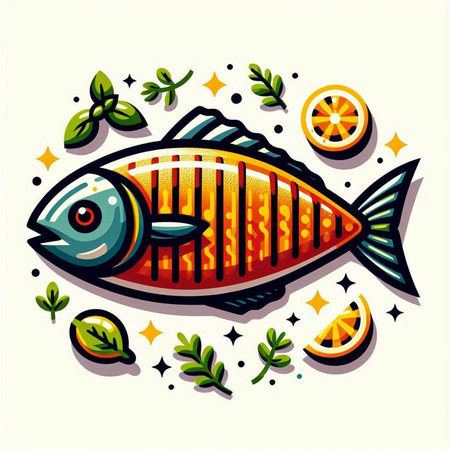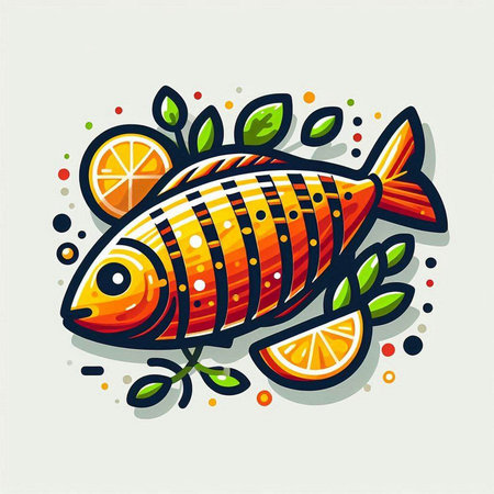 Vector illustration of fish with leaves and orange slices on white background.