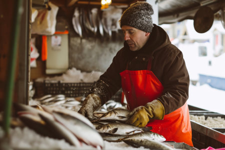 Workers handling fresh fish on ice, industrial setting, blue uniforms, gloved hands, focused, cool lighting