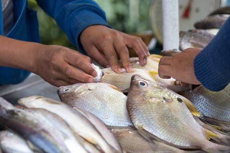 Fresh river fishes in Local Thailand morning market a traditional fish shop, Top view