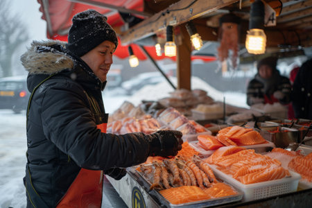 Man in winter jacket standing next to icy display of salmon fillets at outdoor fish market during cold season. Local seafood market