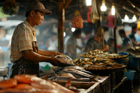 Arabian fish seller market. Eastern fisherman trading seafood on bazaar. Generate ai