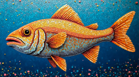 Brightly colored fish artwork displays a detailed mosaic design. Set against a vibrant blue background, this piece highlights artistic skill and creativity through colorful tiles and patterns.