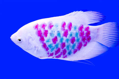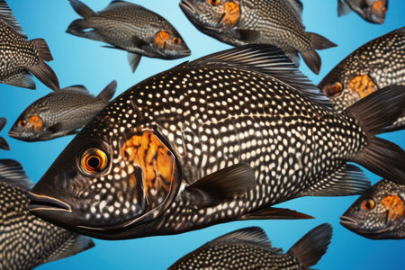 A fish with white dots on its body is swimming in the water. The fish is surrounded by a blue background
