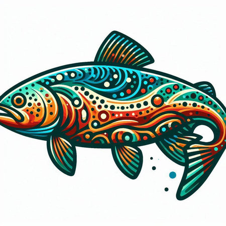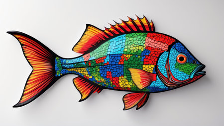 Artistic depiction of a fish featuring a vibrant mosaic pattern in red, blue, green, and yellow tones. Set against a clean white background.