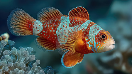 Close up underwater portrait of a vibrant and colorful mandarinfish in its natural marine habitat, showcasing the detailed patterns and vivid colors of this exotic species