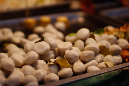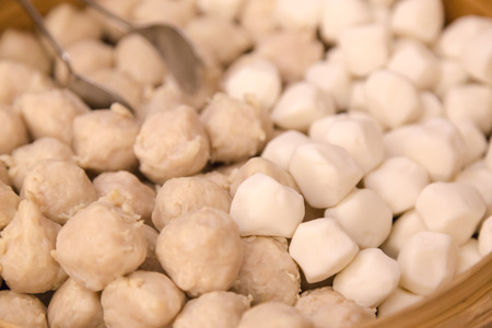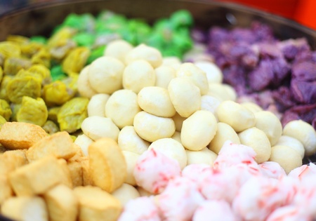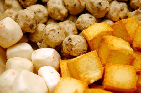 Cooked tofu, beef balls and cheese bun balls for hot pot soup mix