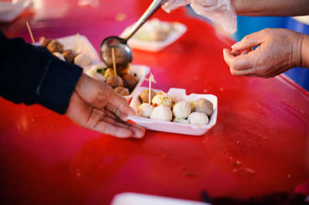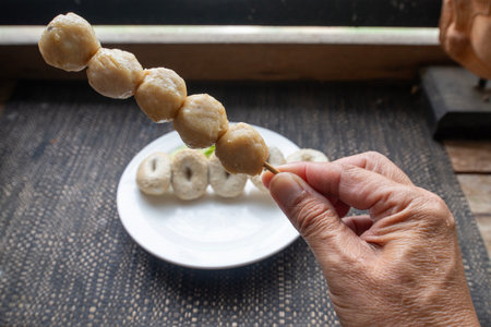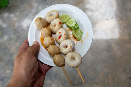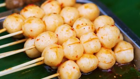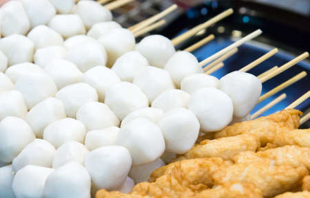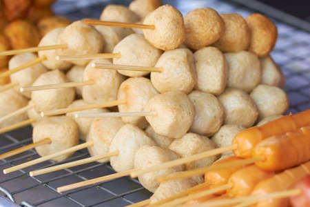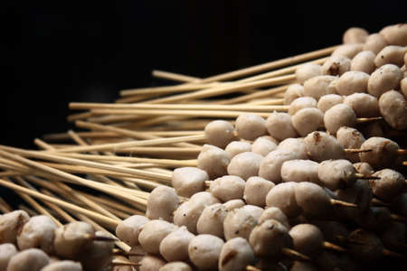 Boiled ball with sticks, Thai style food. Street fast food in Thailand, close up