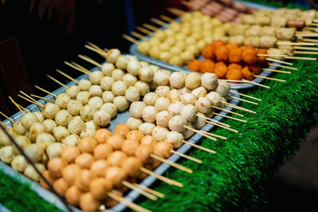 Meat ball variety type of meat (beef; pork and fish) for sale at Thai street food market in Bangkok Thailand