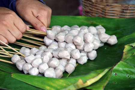 Raw pork ball with wood stick and two hands on banana leaf, Thai lifestyle food in the market.