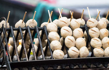Close up of Grill Meatballs on wooden skewers thai street food market