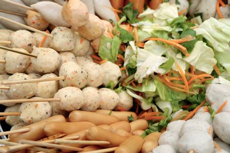 Top view of fresh meat ball on ice for sale in street food (sausage, fish tofu, fish ball, shrimp ball, pork ball and crab stick), for grill or fried