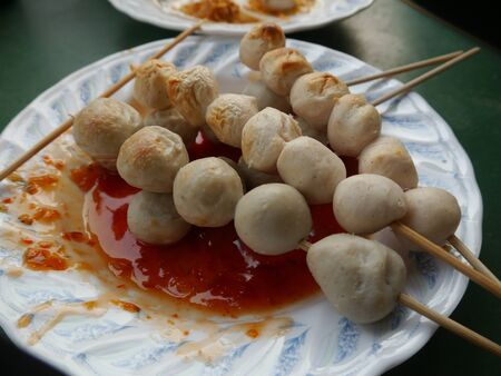 Grilled pork ball with spicy sauce Thai street food, stock photo