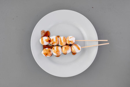 grilled pork ball stabbing in wooden stick dressing spicy and sweet sauce on plate