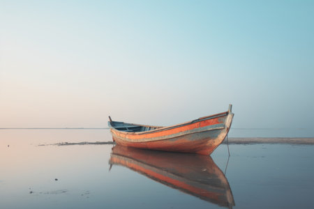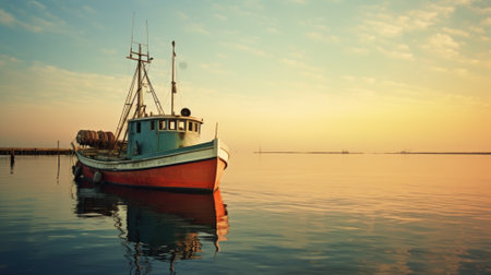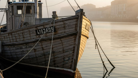 A wooden fishing boat is depicted resting in tranquil waters. The vessel, with weathered textures, is moored by ropes. The scene features soft, diffused lighting, suggesting a hazy atmosphere. The composition hints at coastal activity, suitable for various commercial uses and editorial content related to maritime themes.