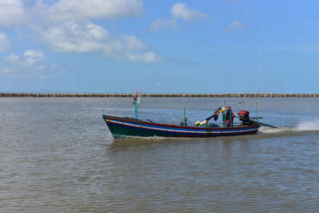 Phetchaburi,Thailand - Mar 15, 2020 : The fisherman and wooden fishing boat used as a vehicle for finding fish in the sea. Selective focus.