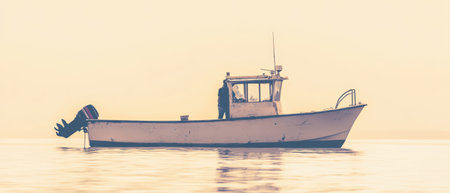 A solitary fishing boat drifts on still water as dawn breaks with a fisherman preparing for the day ahead under a soft morning light.
