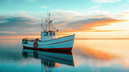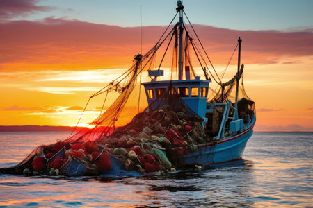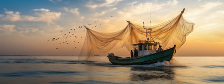 Fishing boat casting nets during sunset on the open sea, showcasing the daily life of fishermen in tranquil waters