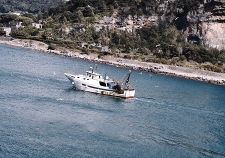 A commercial fishing trawler cuts through the ocean waves, leaving a distinctive white wake behind it. The vessel appears to be at sea under a bright, overcast sky.