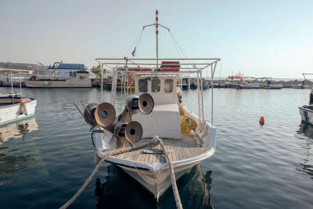 Greek fishing boat at anchor off the coast of the islands of Lesvos in Greece