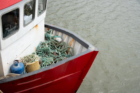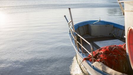 Red wooden fishing boat and nets in the sea. Fishing industry