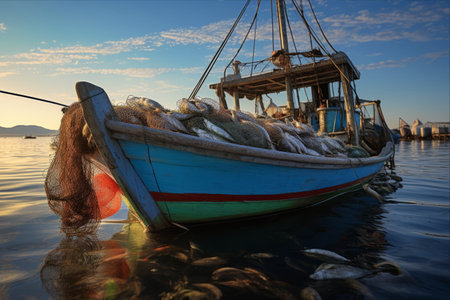 Serene scene. traditional wooden fishing boat expertly catches an abundance of fresh fish at sea