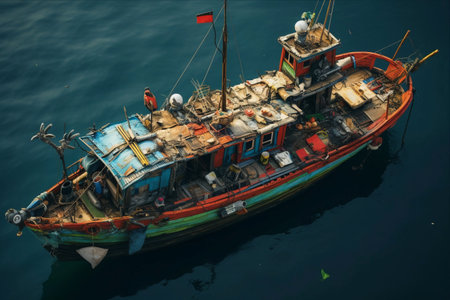 Colorful fishing boat sailing on the open sea, reeling in a bountiful catch of fish