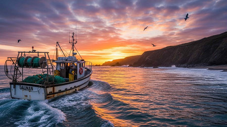 A serene shot of a fishing trawler at dawn, casting nets into the water, highlighting the connection between humans and the ocean's bounty.