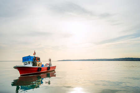 Serene maritime theme with a small ship. Small fishing boat sailing in an open sea. Leisure activity, sport and recreation, food industry.