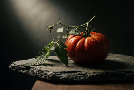A fresh red heirloom tomato sits on a rough grey slate slab featuring green leaves attached to the vine and water droplets under dramatic low key lighting against a dark background.