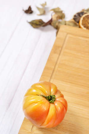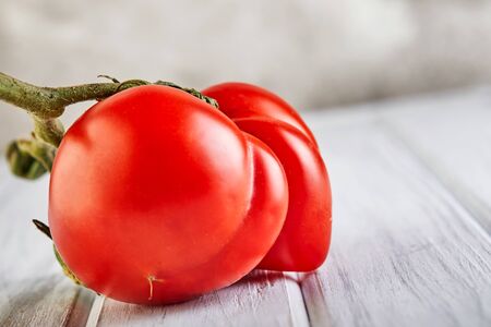 Organic fresh tomato on a white wooden background.
