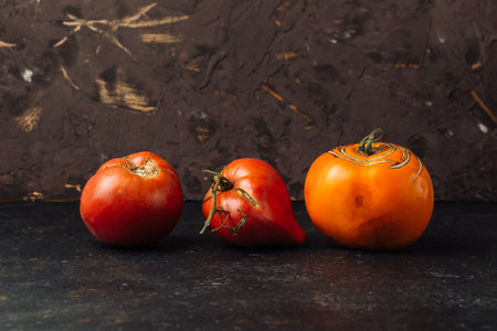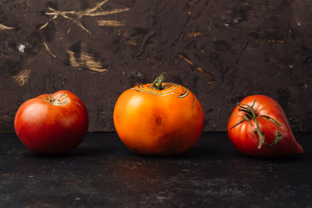 Spoiled tomato on a gray concrete background. Top view.