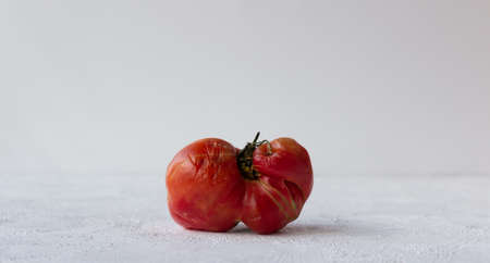 Ugly tomato and leaves on a white background with space for text. Banner, wallpaper, advertising.