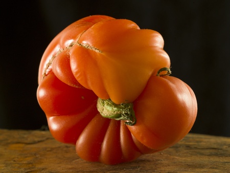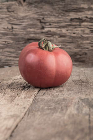A closeup of Mortgage Lifter tomato on the wooden background.